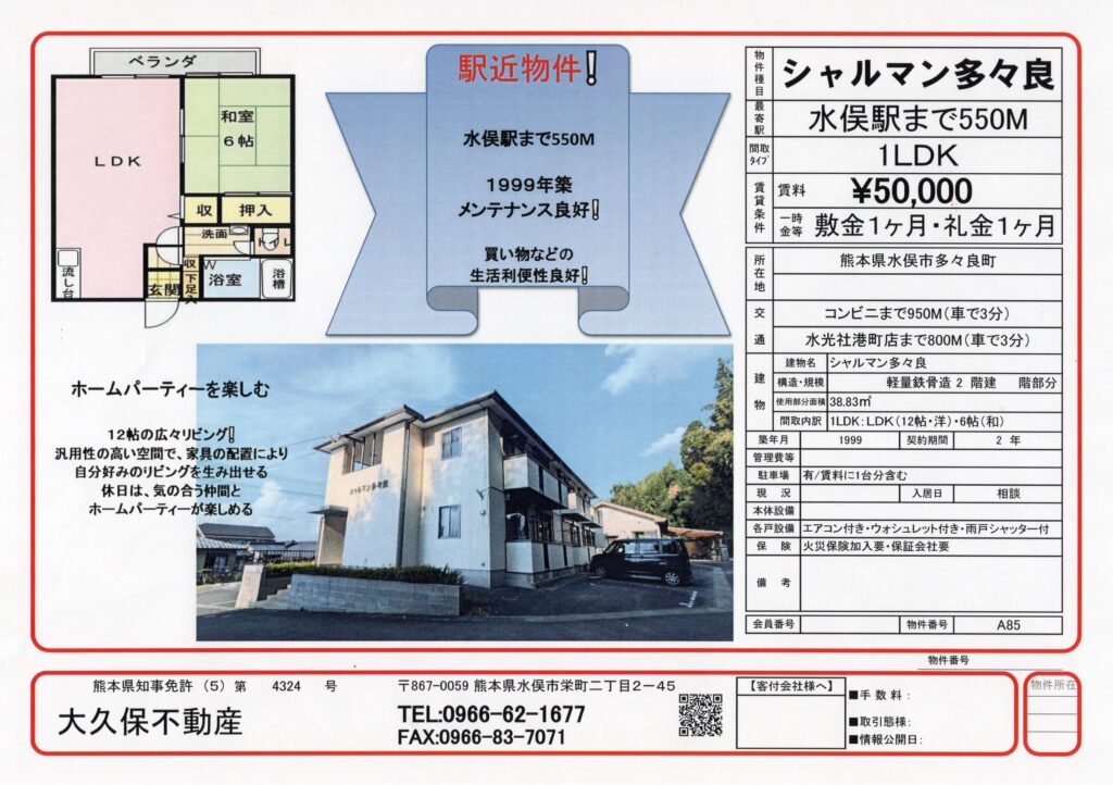 水俣駅まで550Mと駅近物件・12帖のリビングで広々とした汎用性の高い空間・軽量鉄骨造りで耐震性に強い・静かで、陽当り、風通し良好